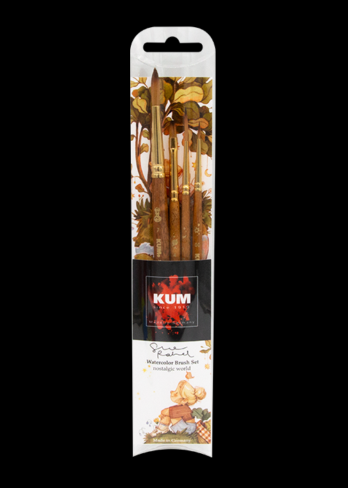 Includes a size 7 round brush, a size 2 liner, a size 4 flat brush, and a fine size 0. Specially developed by Sue with Kum.